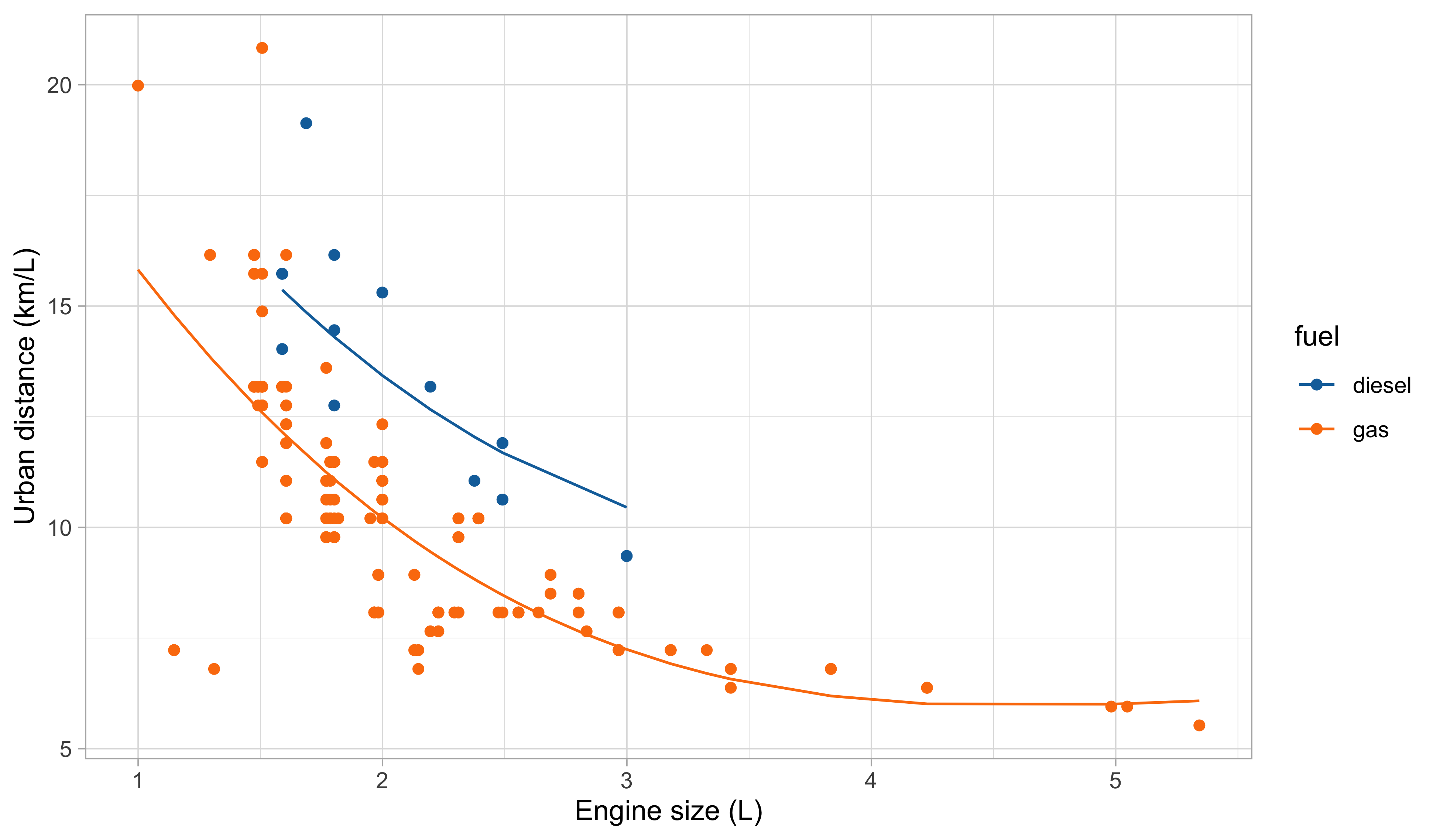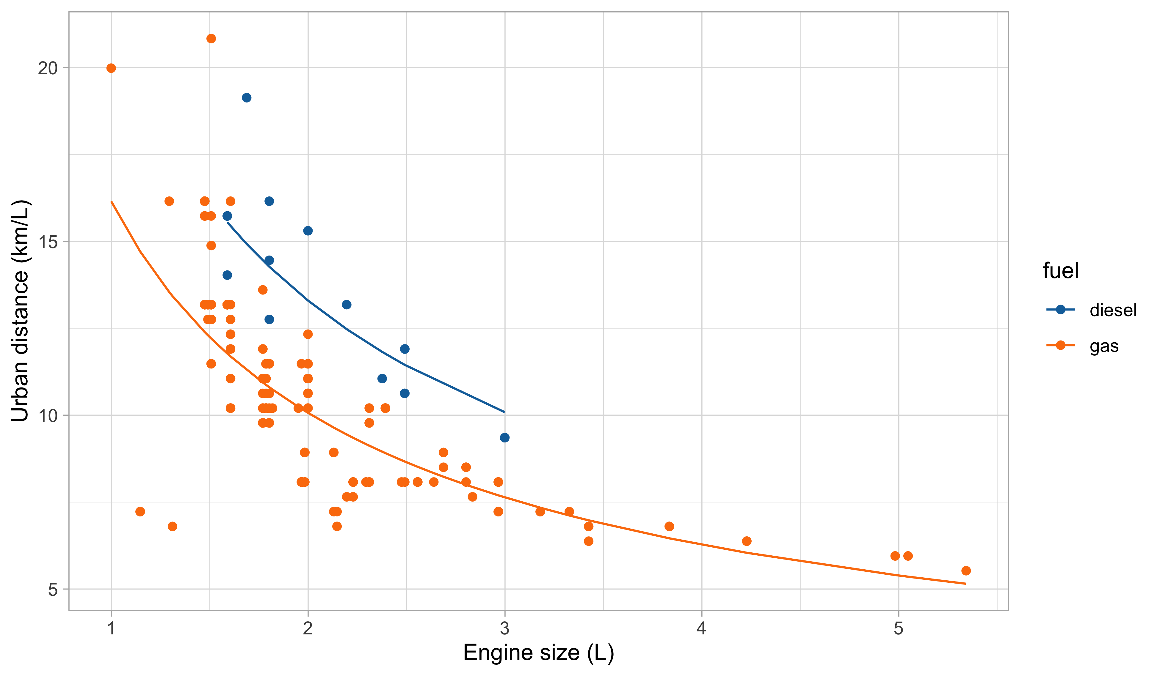 It is also more coherent with the nature of the data: the predictions cannot be negative, and the relationship between engine size and the consumption is monotone.