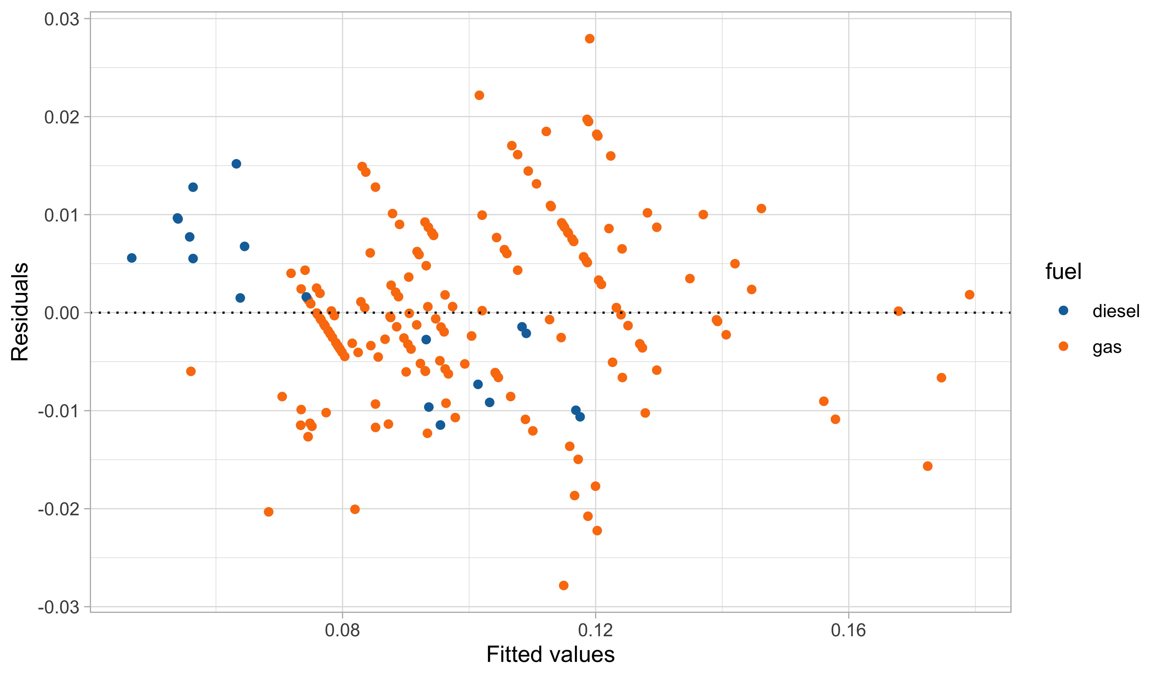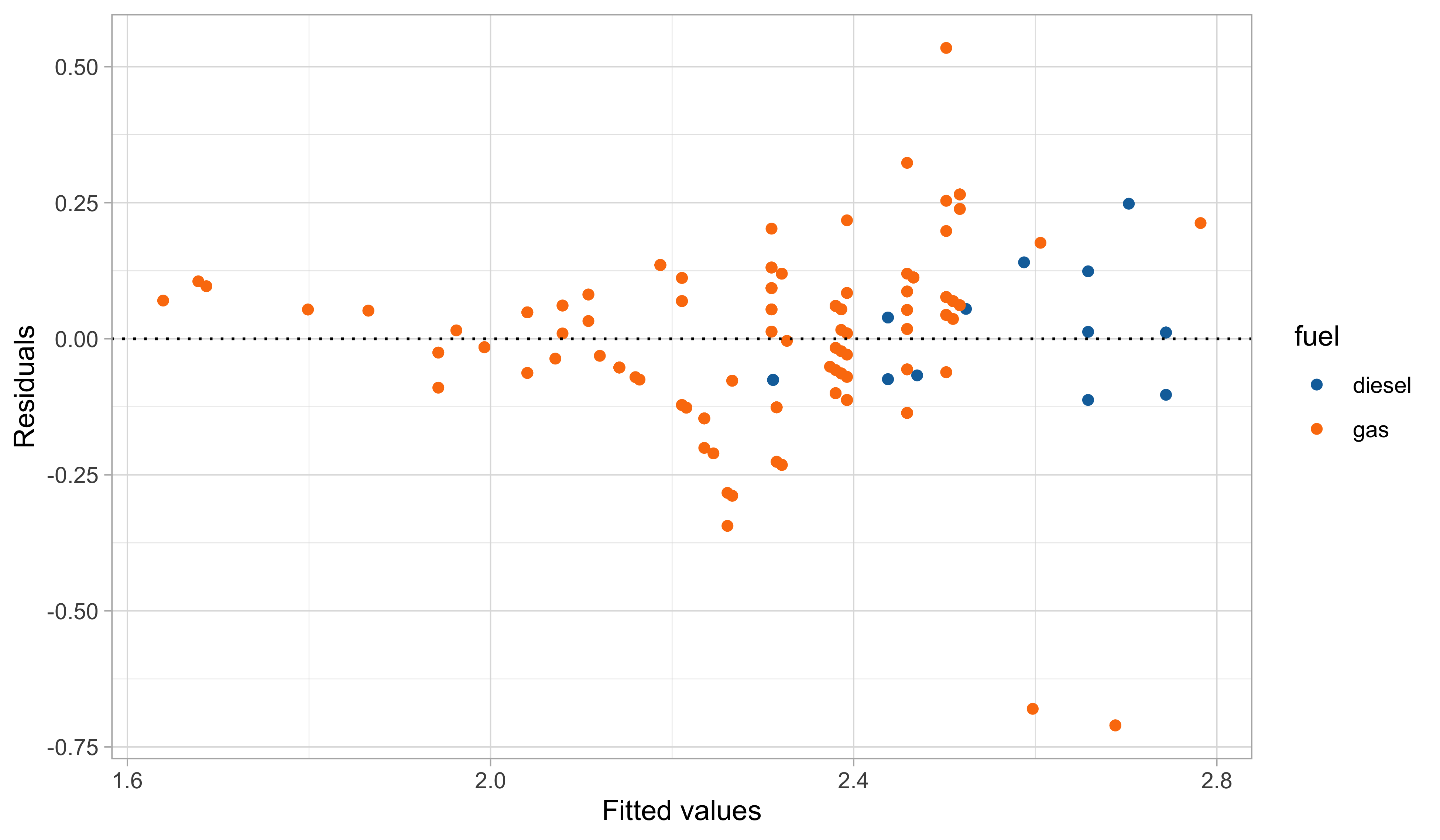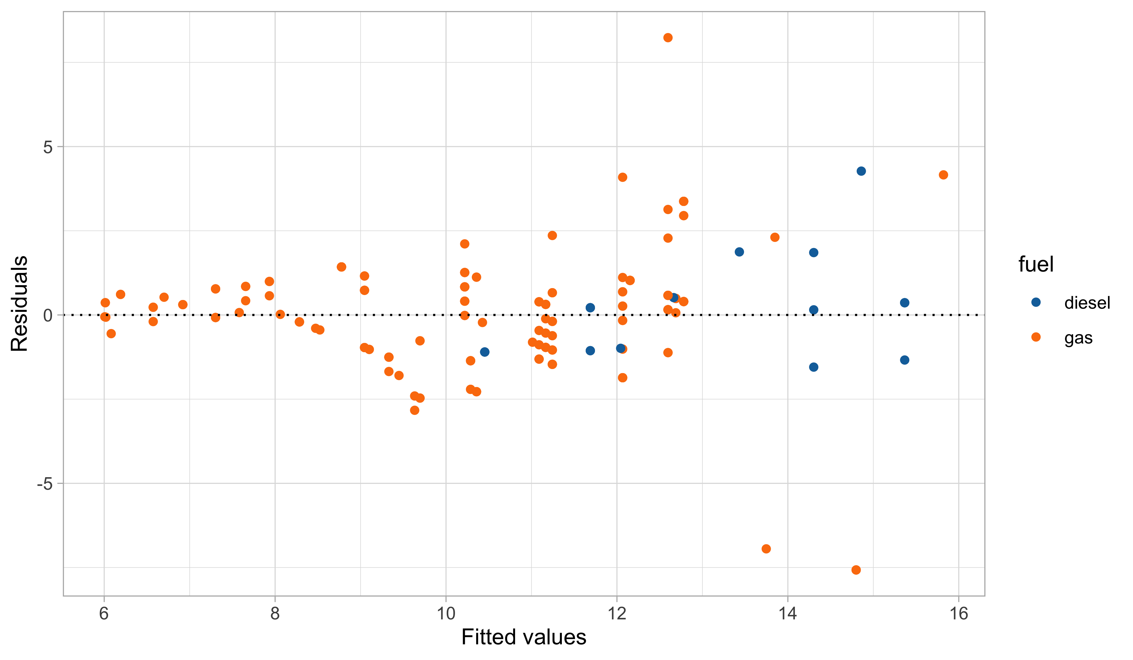 In this third model, we handled the outliers appearing in the residual plots, which it turns out are identified by the group of cars having 2 cylinders.