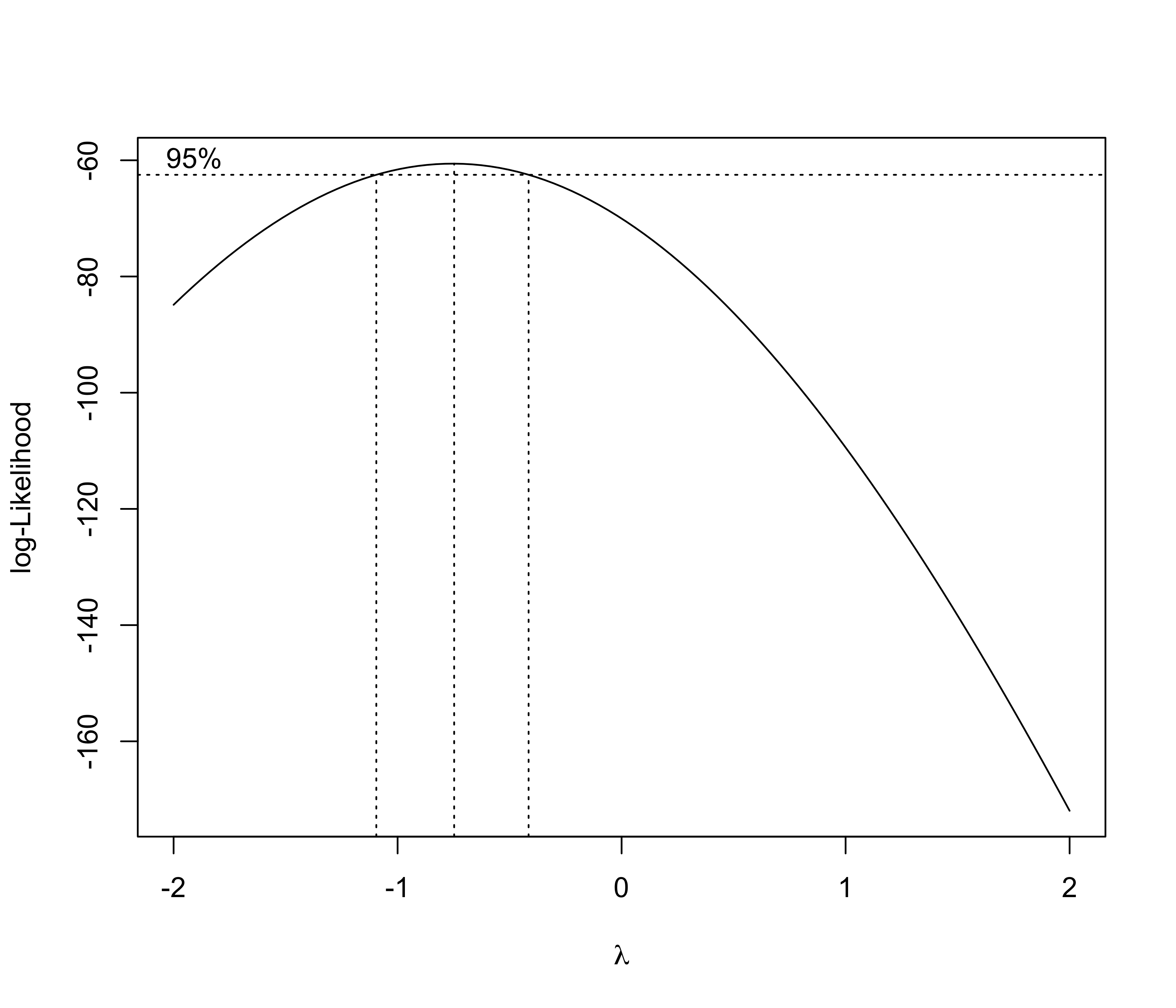 We estimate \lambda from the data using maximum likelihood, so that the data themselves can inform us about the best transformation. We assume g_\lambda(Y_i) = \bm{x}_i^T\beta + \epsilon_i, \qquad \epsilon_i \sim \text{N}(0, \sigma^2), \qquad i=1,\dots,n.