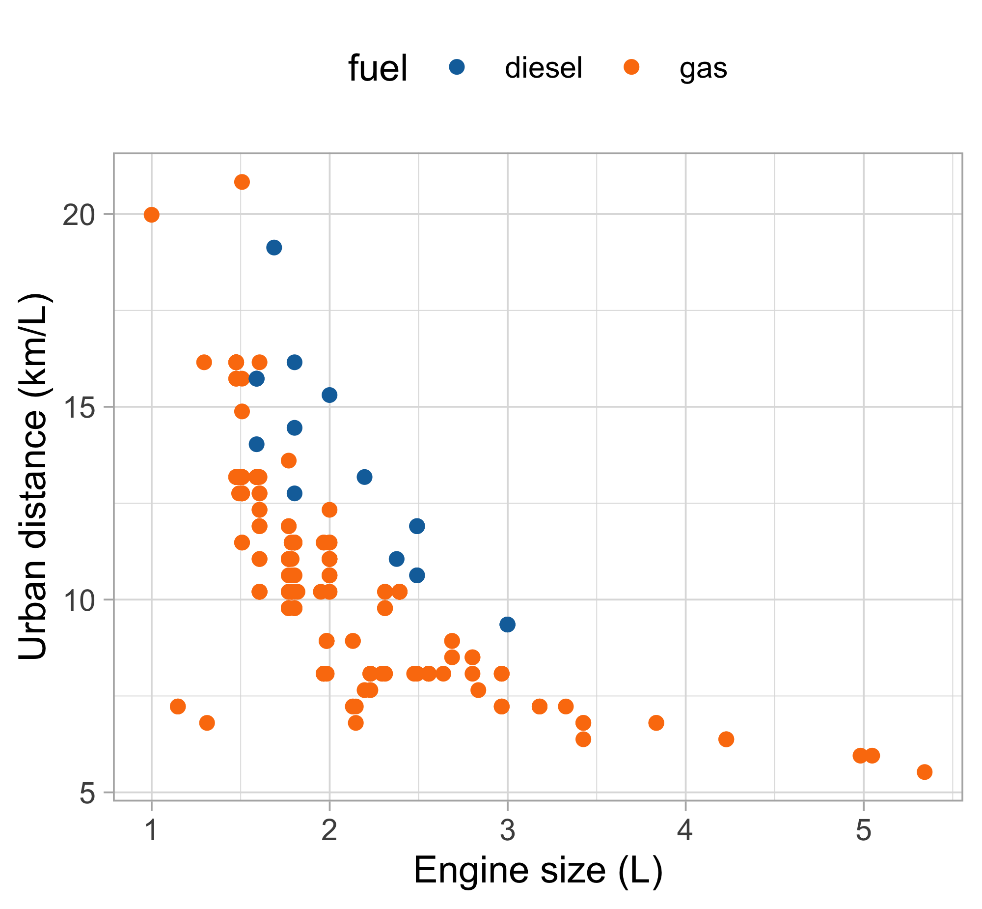 Let us consider the variables city.distance (y), engine.size (x) and fuel (z).
