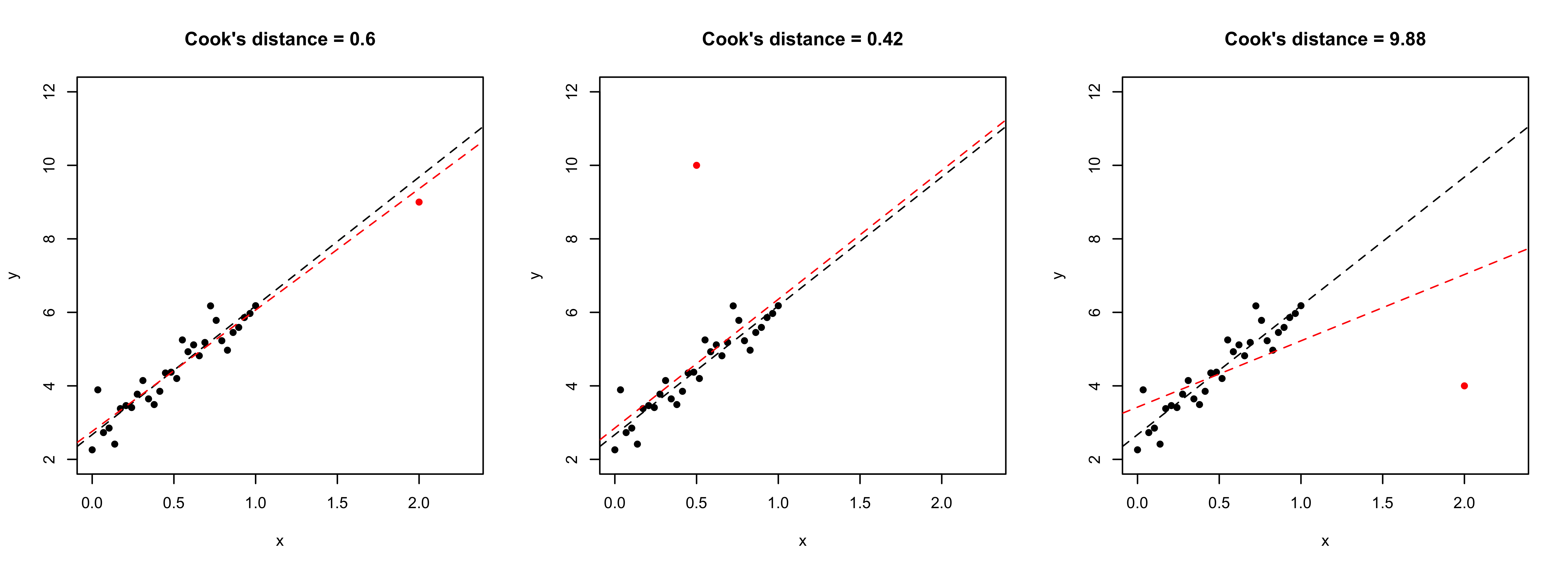 Leverages also appear in the definition of standardized residuals: \tilde{r}_i = \frac{r_i}{\sqrt{s^2(1 - h_i)}} = \frac{y_i - \bm{x}_i^T\hat{\beta}}{\sqrt{s^2(1 - h_i)}}, where r_i = y_i - \bm{x}_i^T\hat{\beta} are the (raw) residuals.