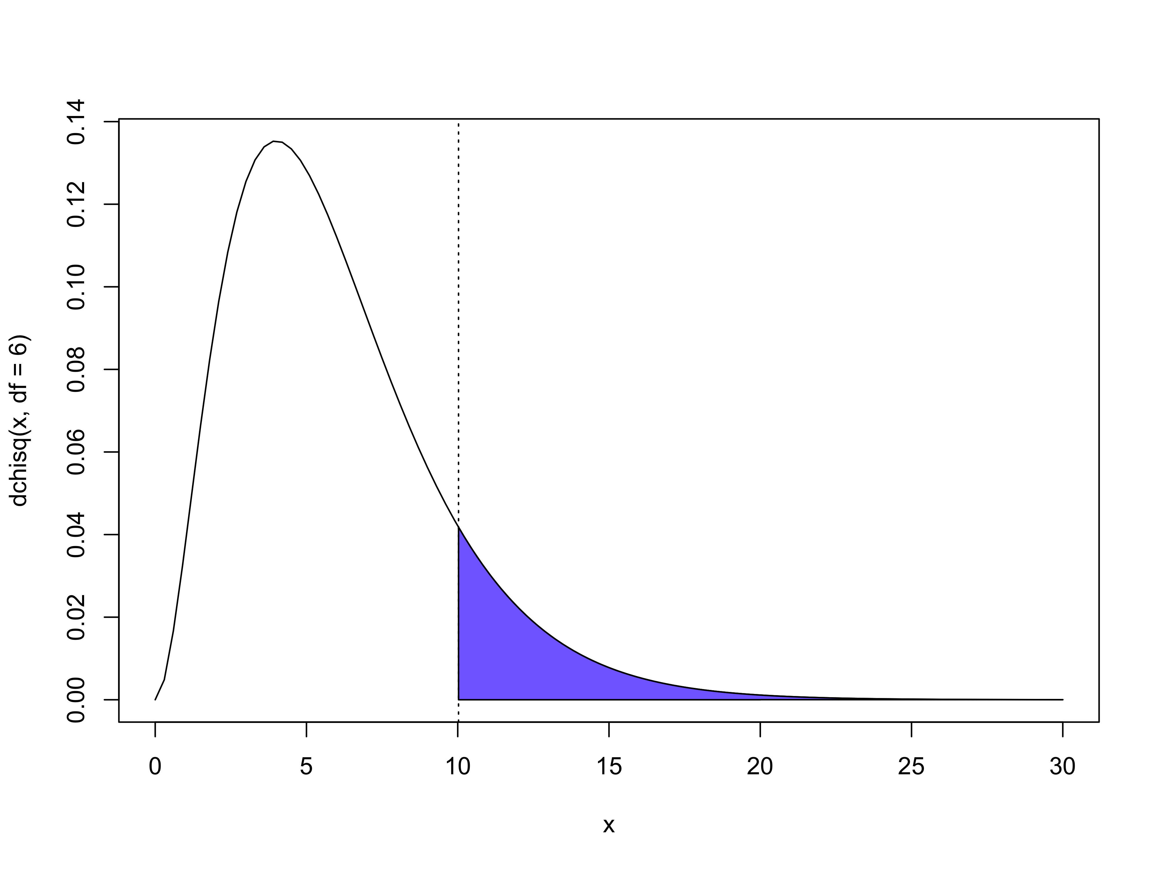 Using the X^2 statistic with 6 degrees of freedom, we obtain the p-value \mathbb{P}(X^2 > 10.027) = 0.124, as pictured above, which can be interpreted as a slight lack of fit.