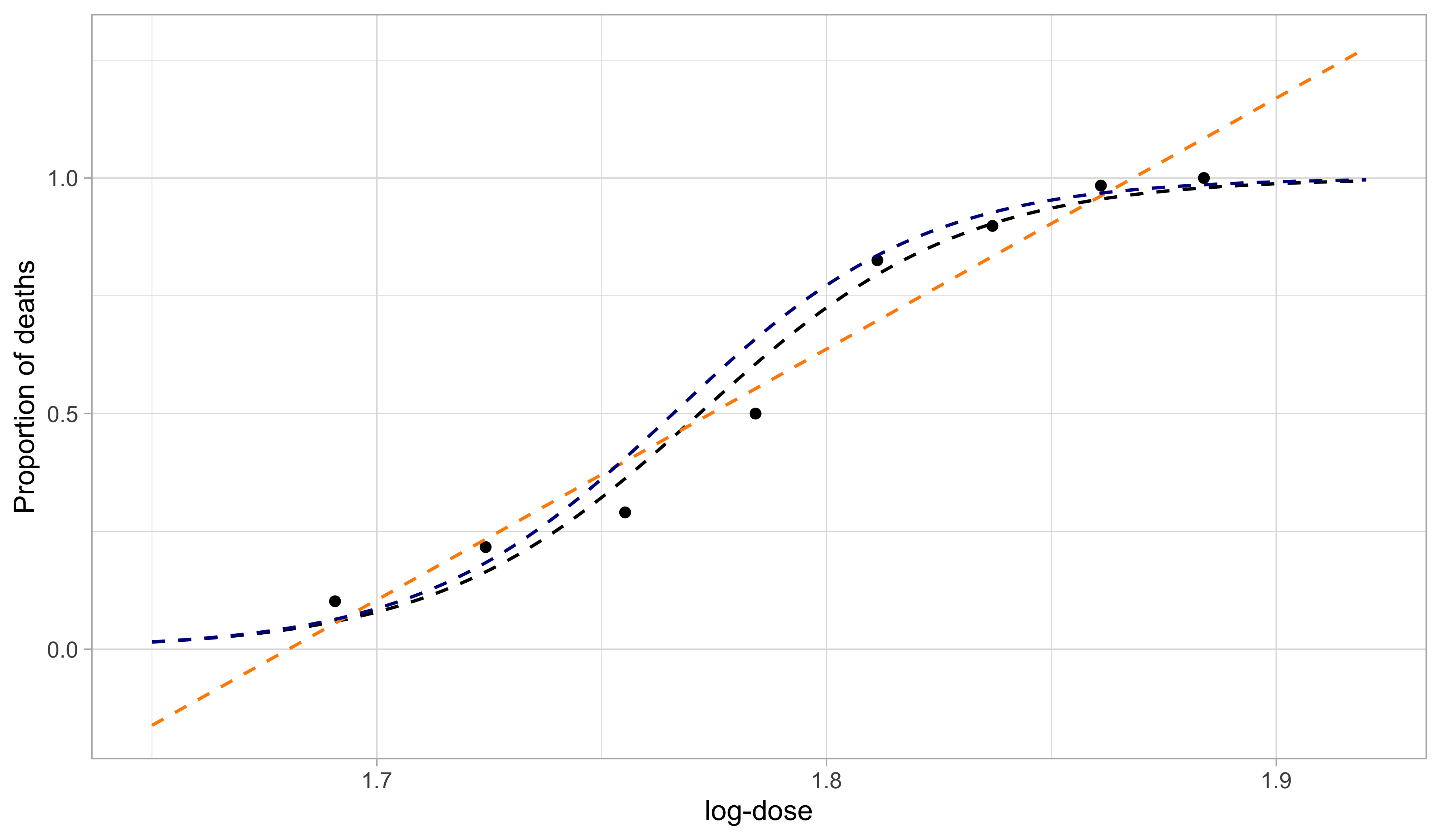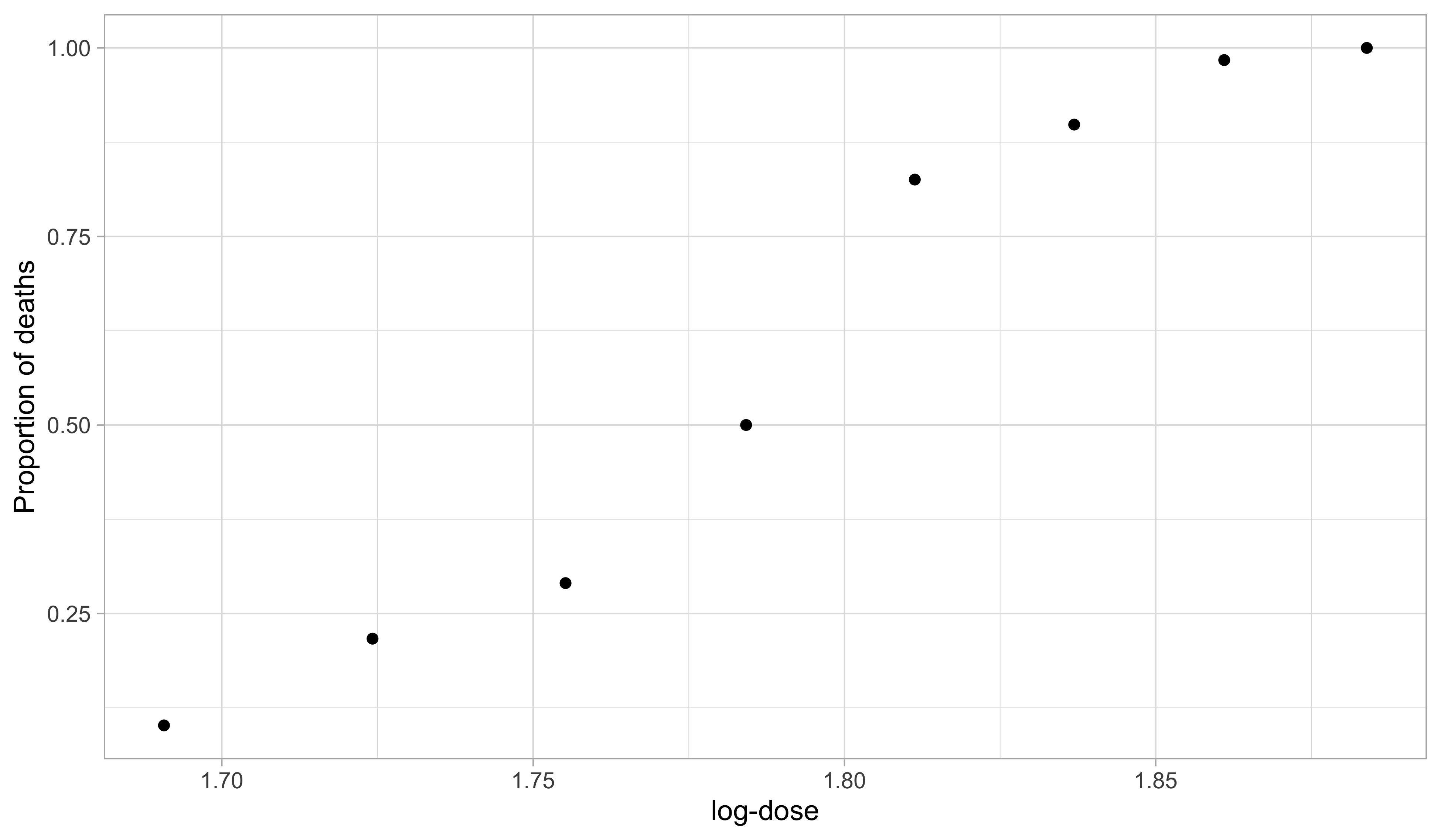 Beetles data, a dose-response plotBeetles dataLet S_i be the number of dead beetles out of m_i, and let x_i denote the log-dose. By definition, S_i \in \{0, 1, \dots, m_i\} for i = 1,\dots,8.