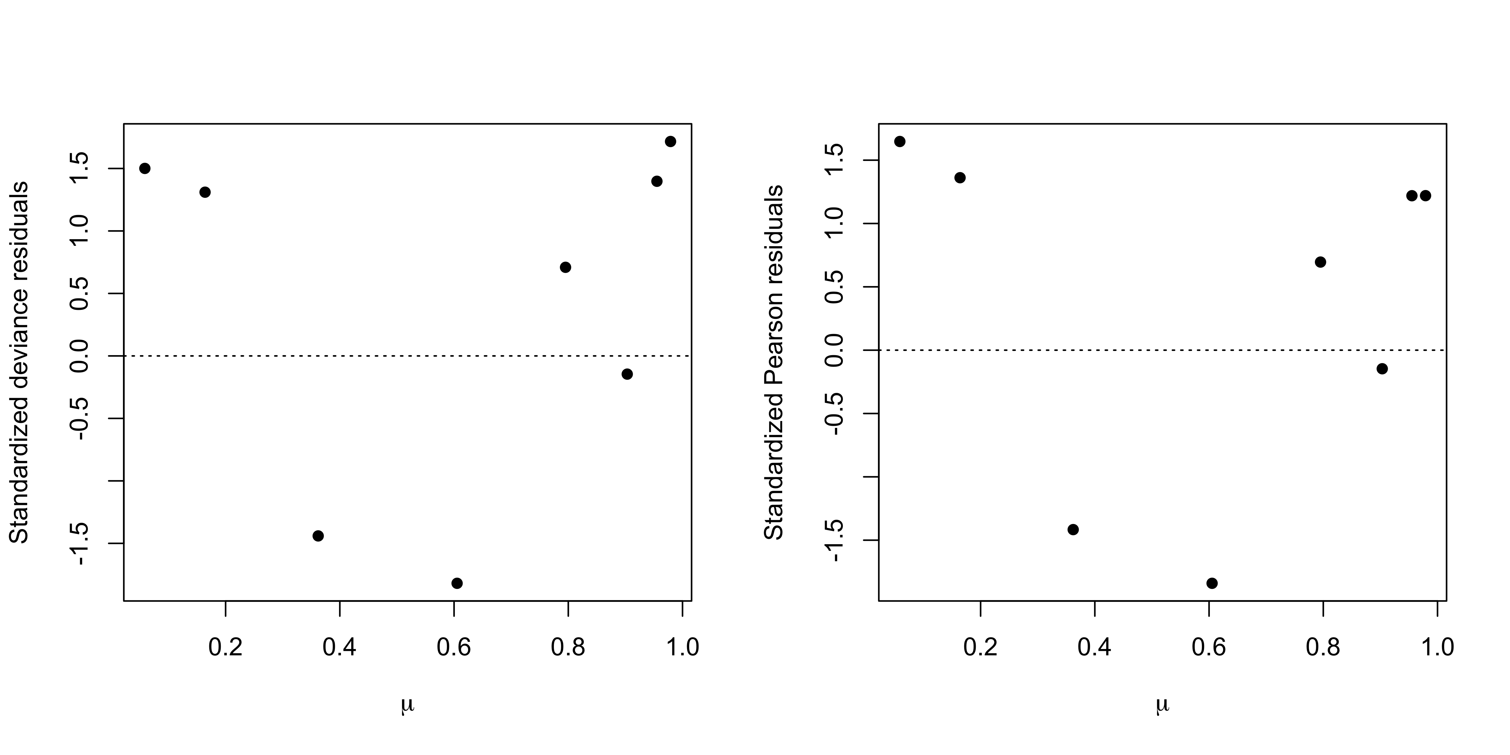 Beetles dataA formal test already confirmed that there are no noticeable differences between this model and the saturated model. The analysis of the residuals confirms it.
