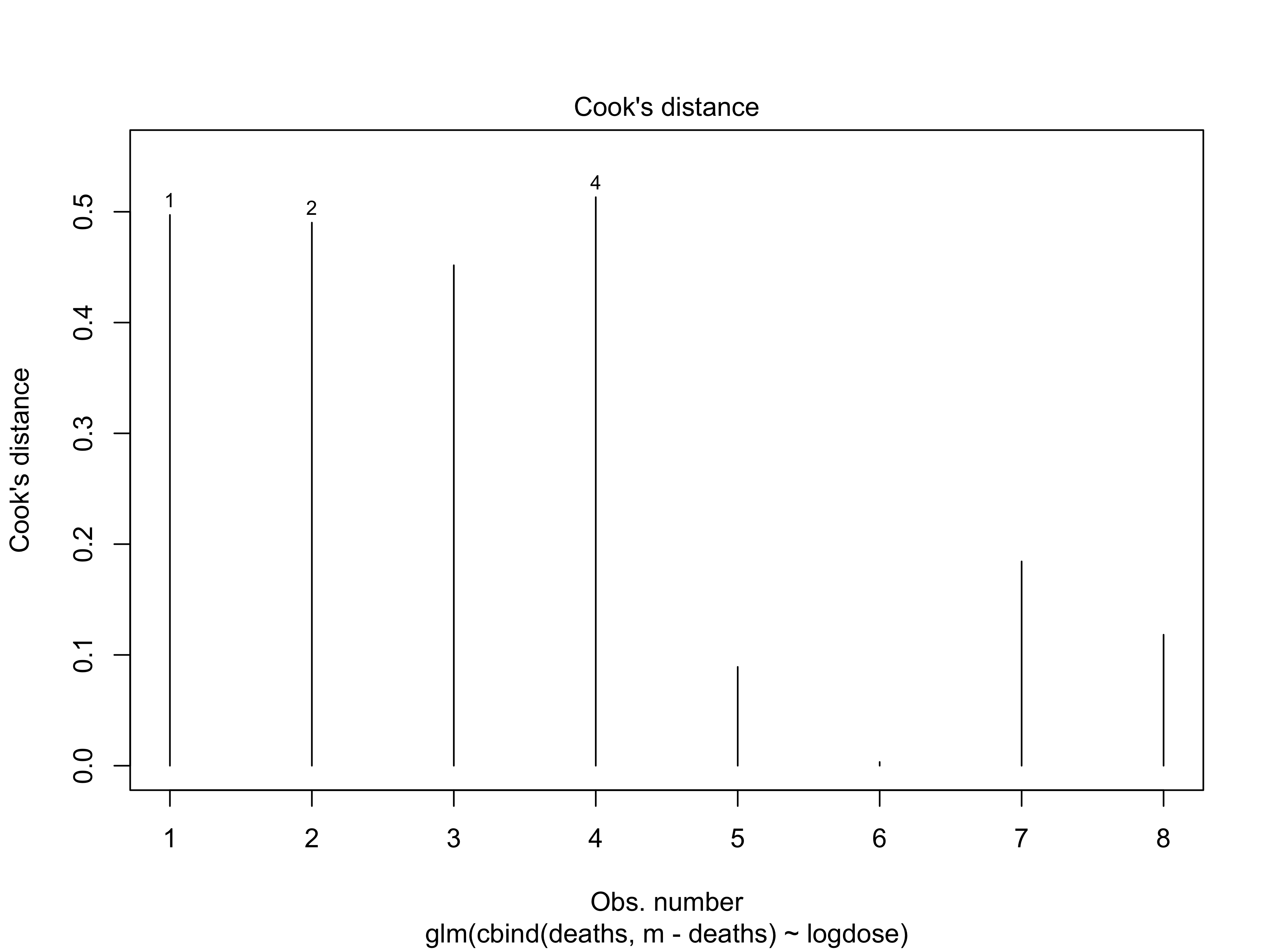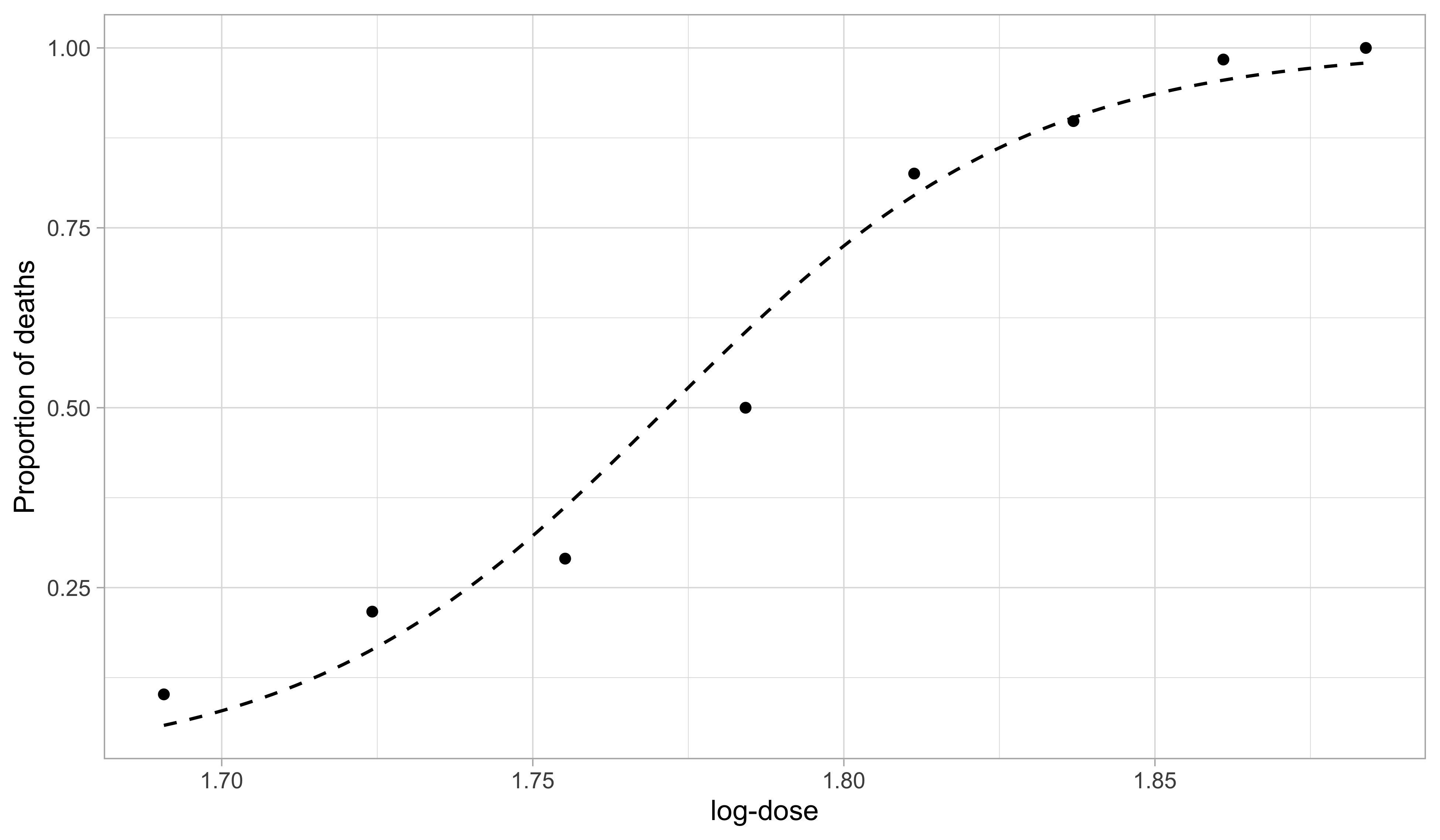 Beetles data, from Bliss (1935)Beetles dataset originates from Bliss (1935). It records the number of adult flour beetles that died after a 5-hour exposure to gaseous carbon disulphide.| m | deaths | logdose |