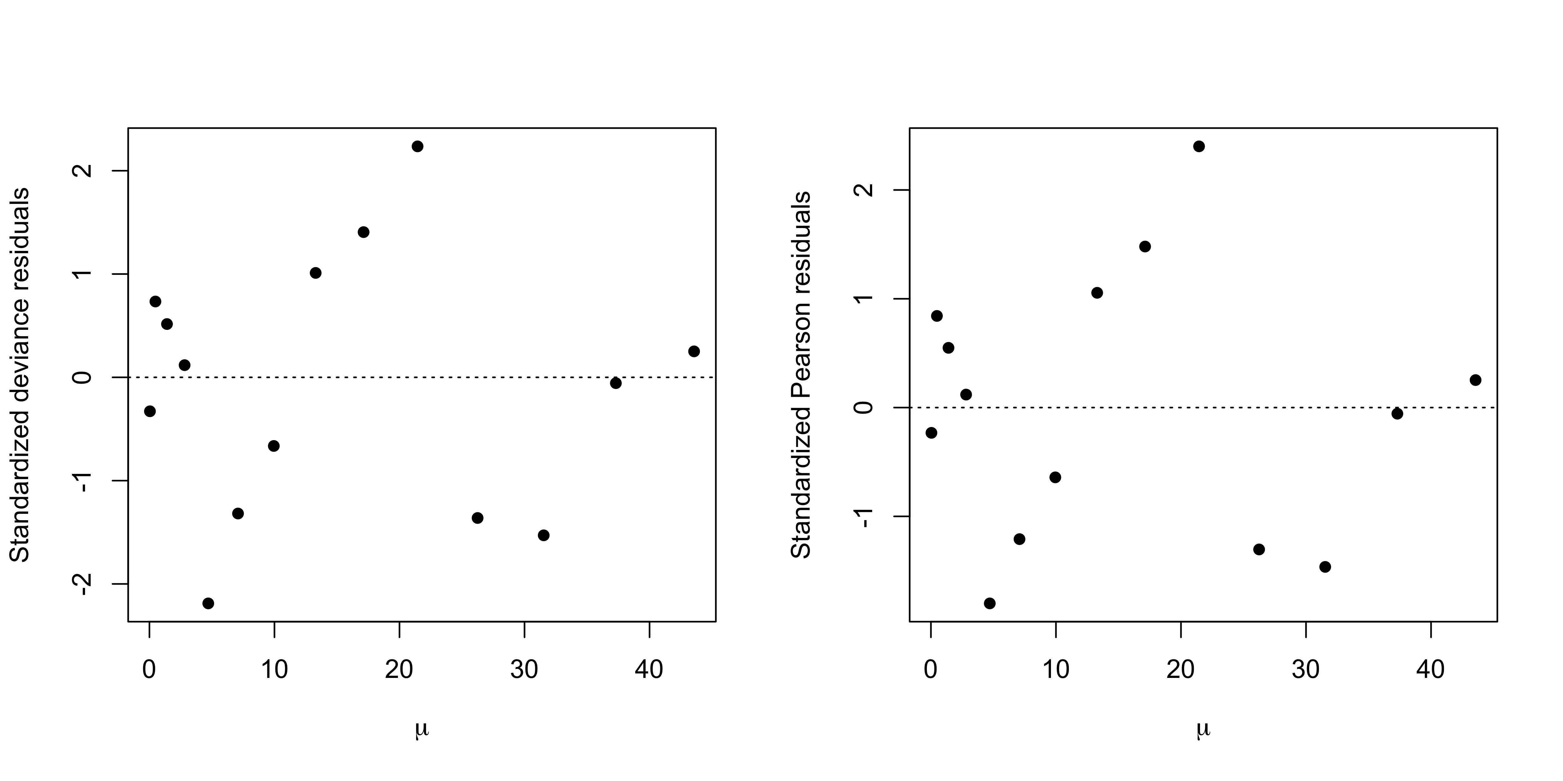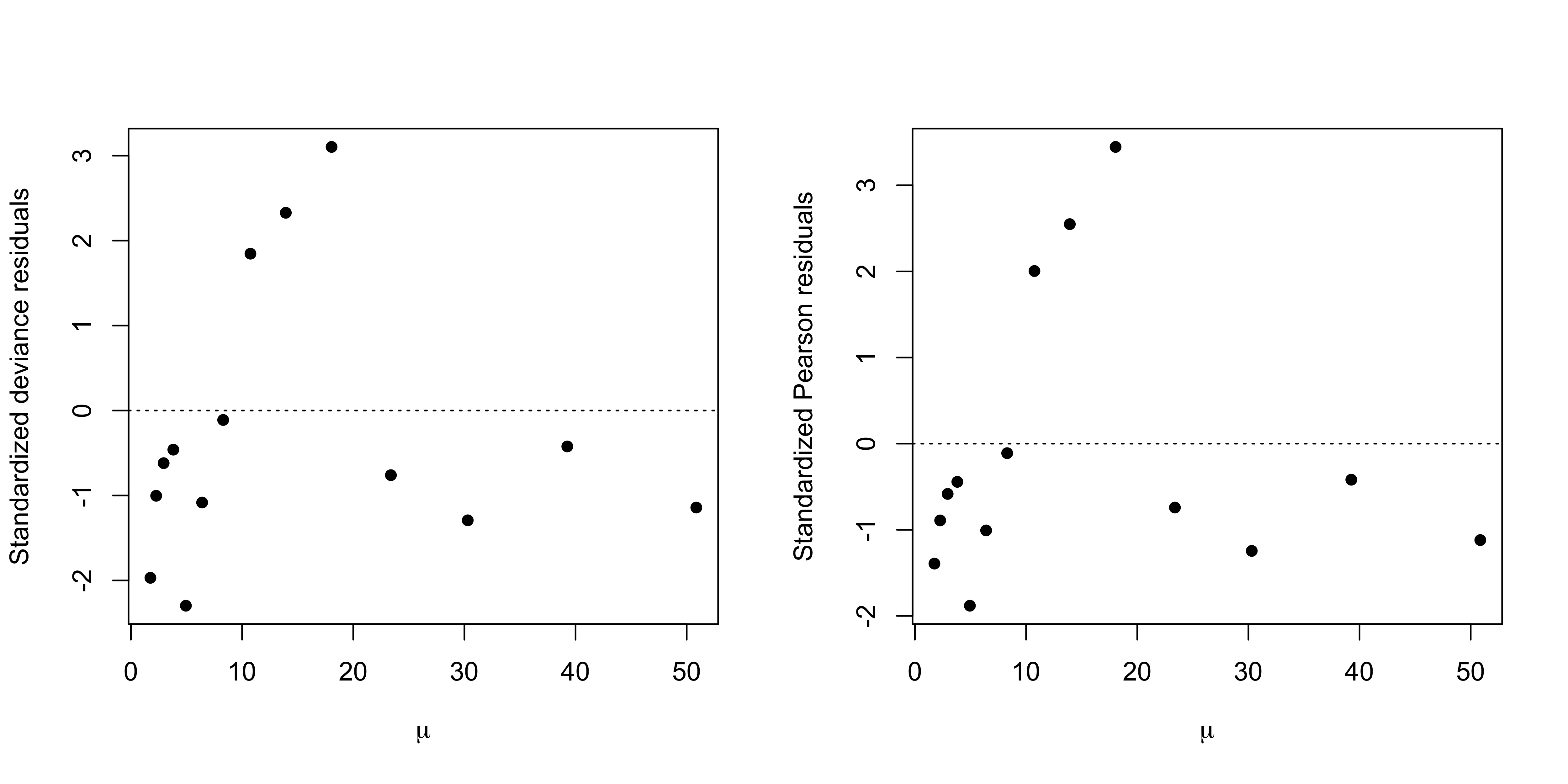 Aids data, goodness of fitThe deviance equals D(\bm{y}; \hat{\bm{\mu}}) = 30.203, with n - p = 14 - 2 = 12 degrees of freedom. The observed X^2 Pearson statistic equals 29.92.