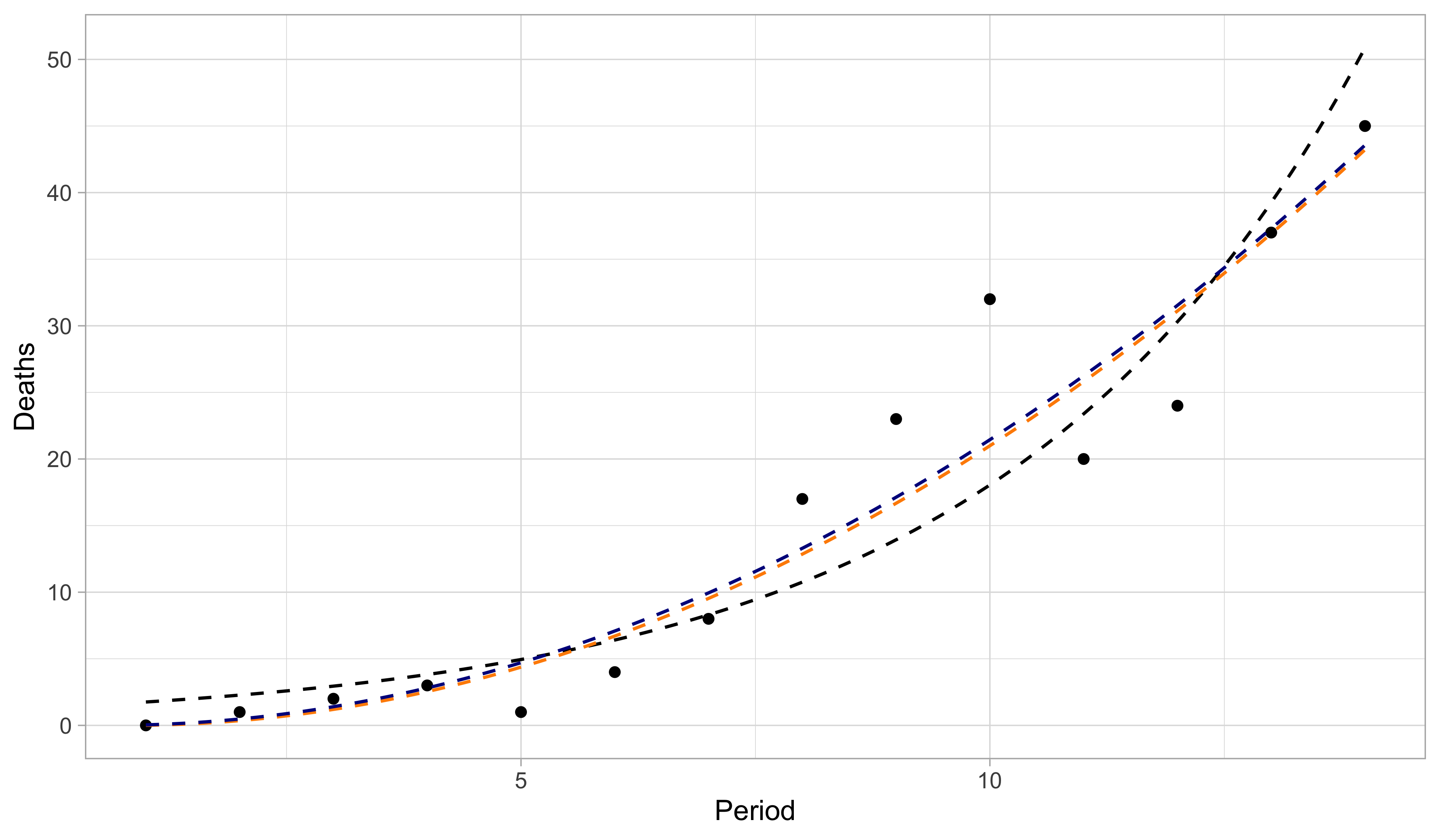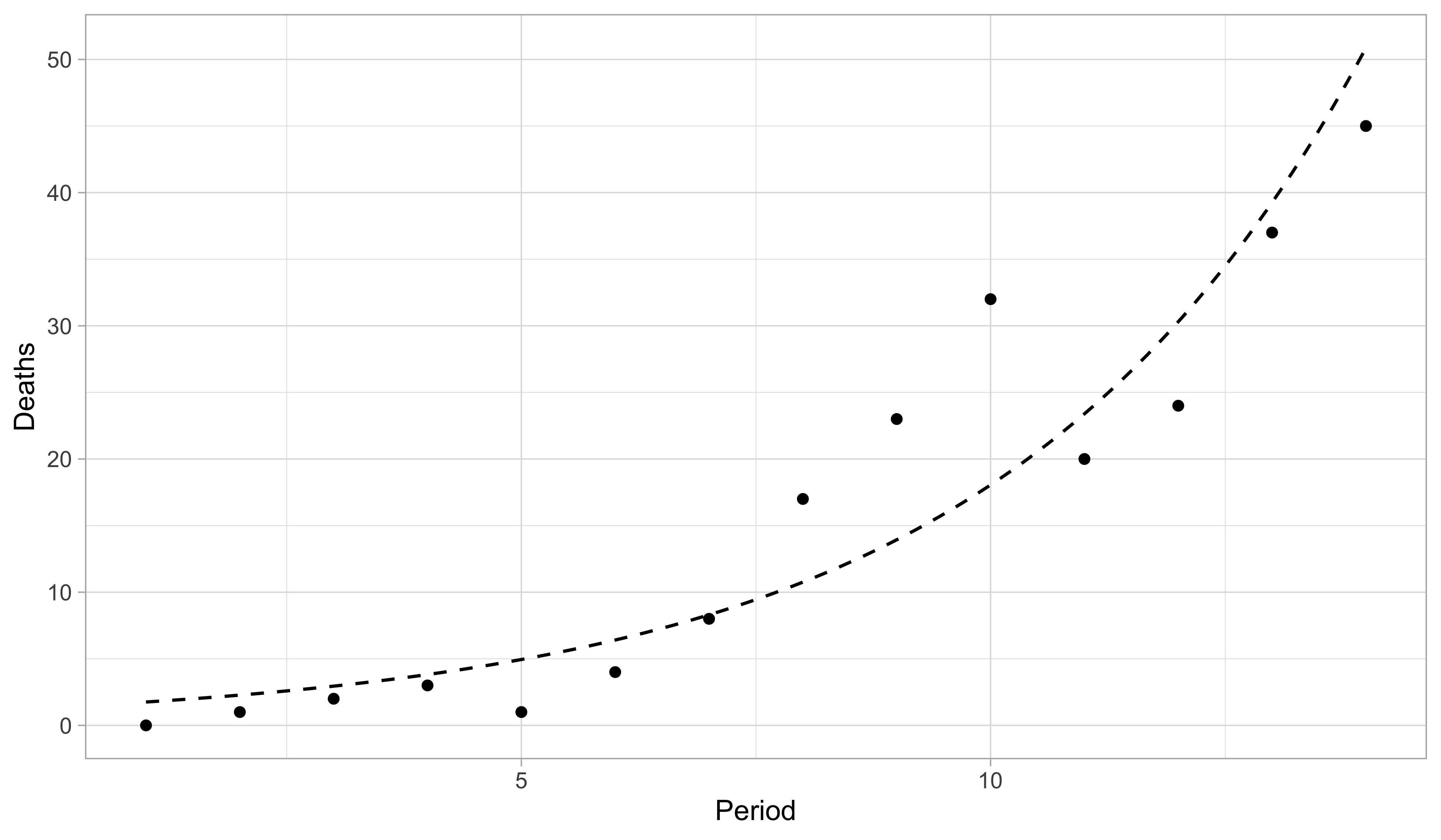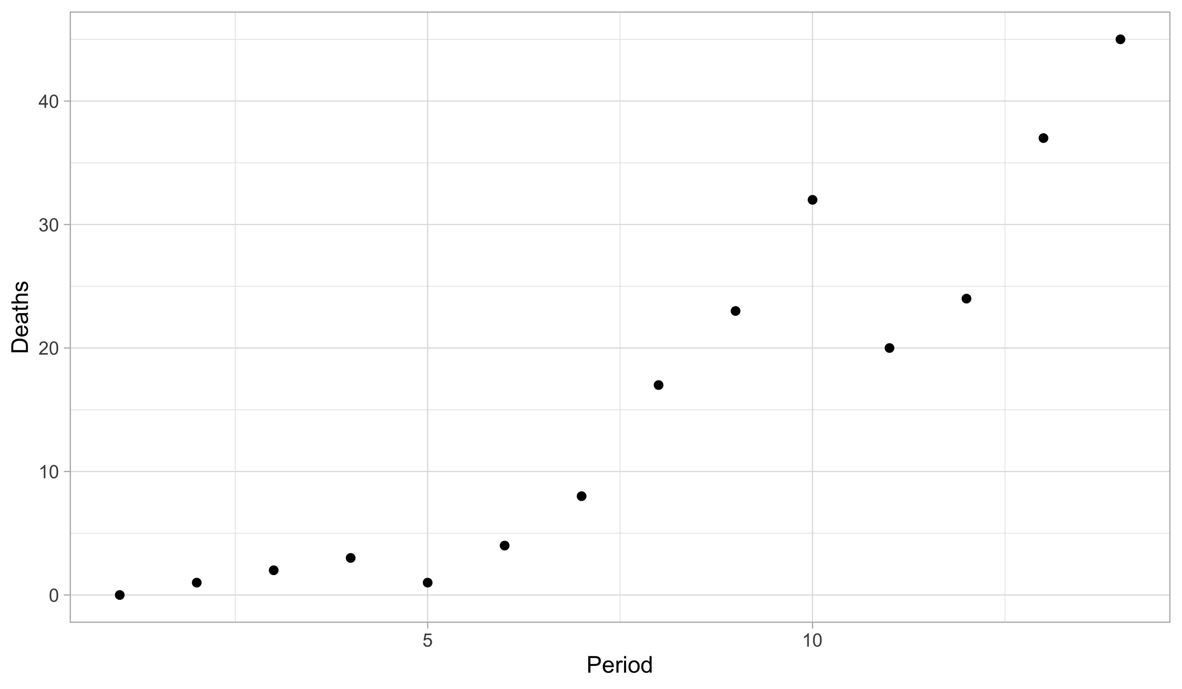 Aids data, scatter plotAids dataWe model Y_i as independent Poisson random variables, counting the number of deaths: Y_i \overset{\text{ind}}{\sim} \text{Poisson}(\mu_i), \qquad i = 1,\dots,14, where \mu_i is the mean of Y_i, namely \mathbb{E}(Y_i) = \mu_i.