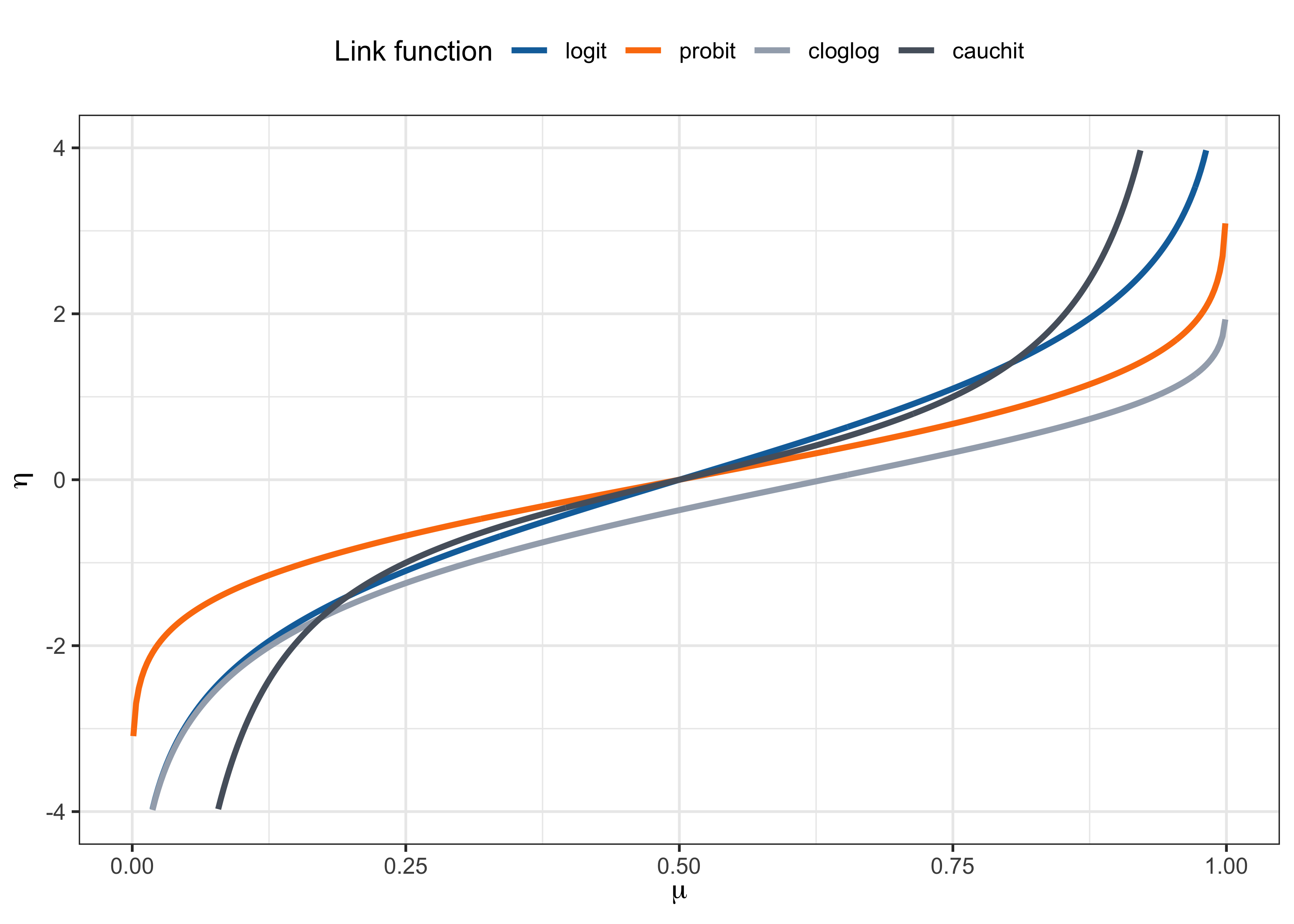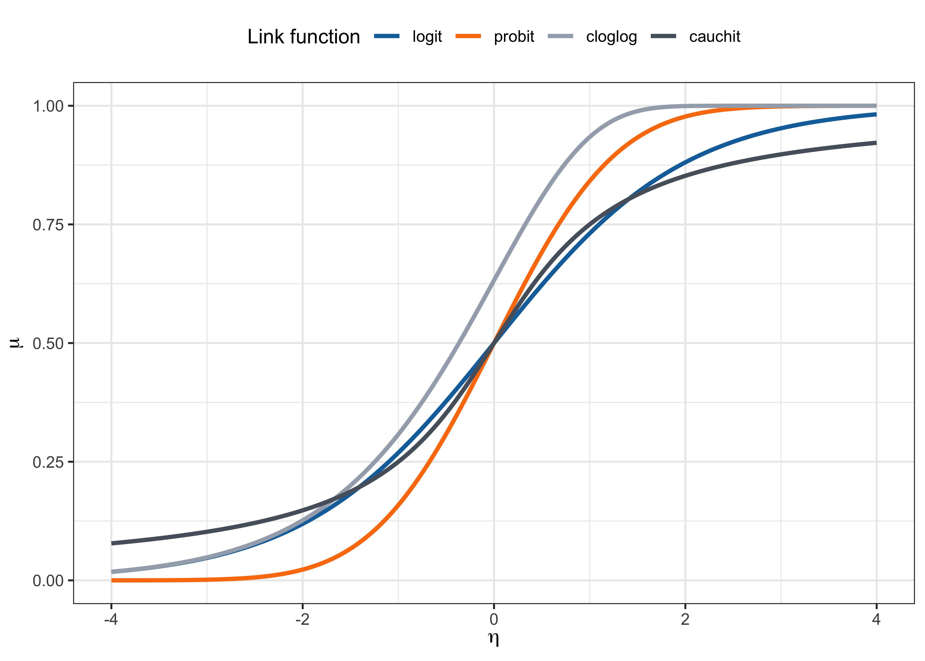 Cauchy link. The Cauchy link is g(\pi_i) = \tan(\pi(\pi_i - 1/2)), \qquad \text{with inverse} \qquad \pi_i = \frac{1}{2} + \frac{\text{arctan}(\bm{x}_i^T\beta)}{\pi}. F(z) = 1/2 + \text{arctan}(z)/\pi with z \in \mathbb{R} is the cdf of a standard Cauchy distribution.