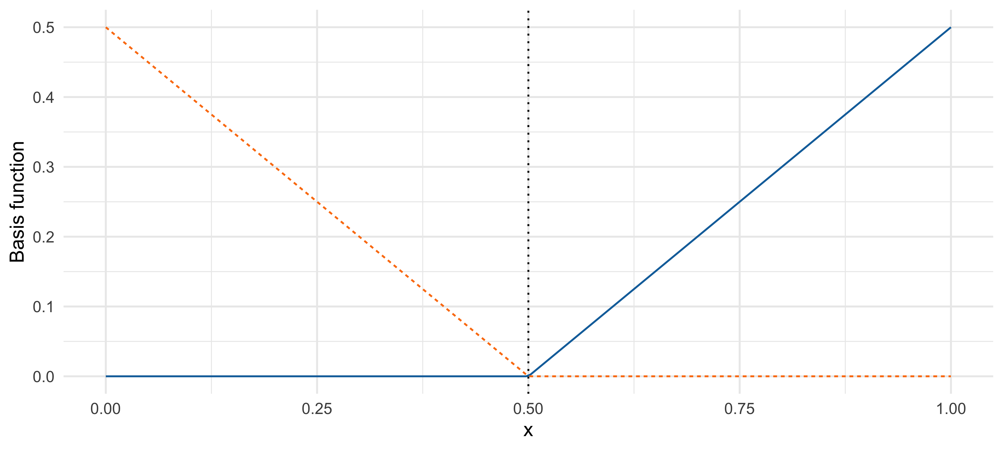 Let us consider the following set of pairs of basis functions (linear splines): \mathcal{C} = \{(x_j - \xi)_+, (\xi - x_j)_+ : \xi \in \{x_{1j},\dots,x_{nj}\}, \ j=1,\dots,p \}. For example, two basis functions could be h_1(\bm{x}) = (x_1 - 0.5)_+ and h_2(\bm{x}) = (0.5 - x_1)_+.