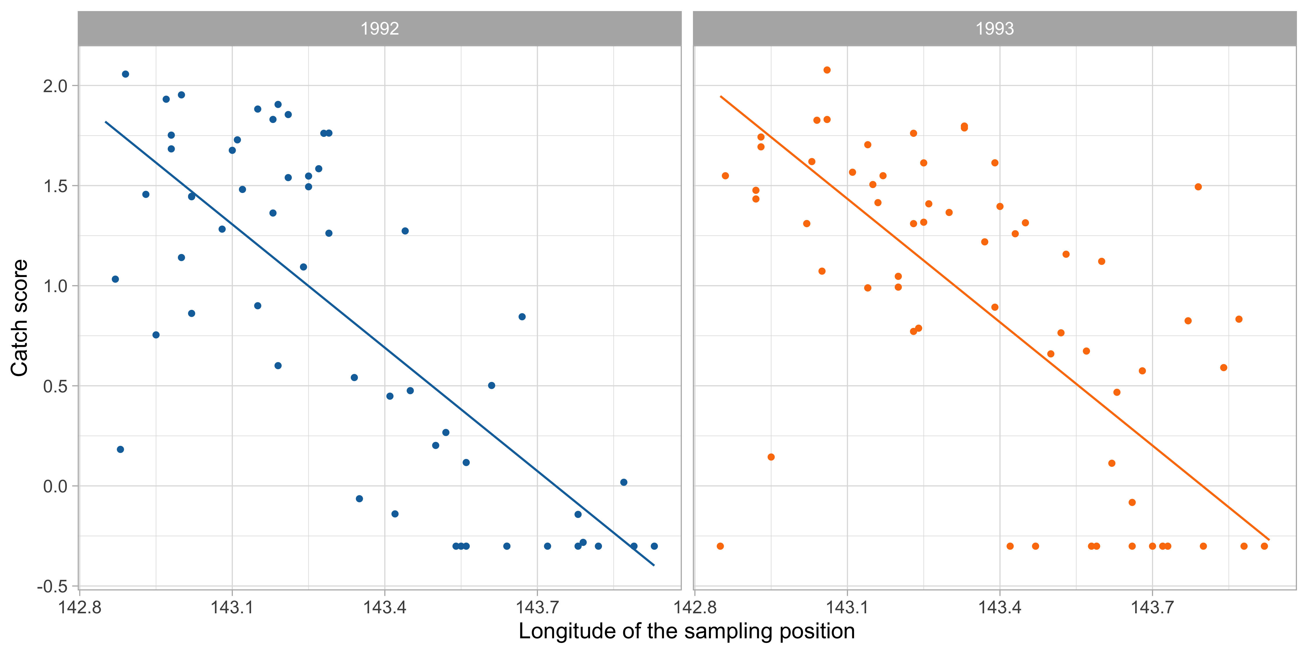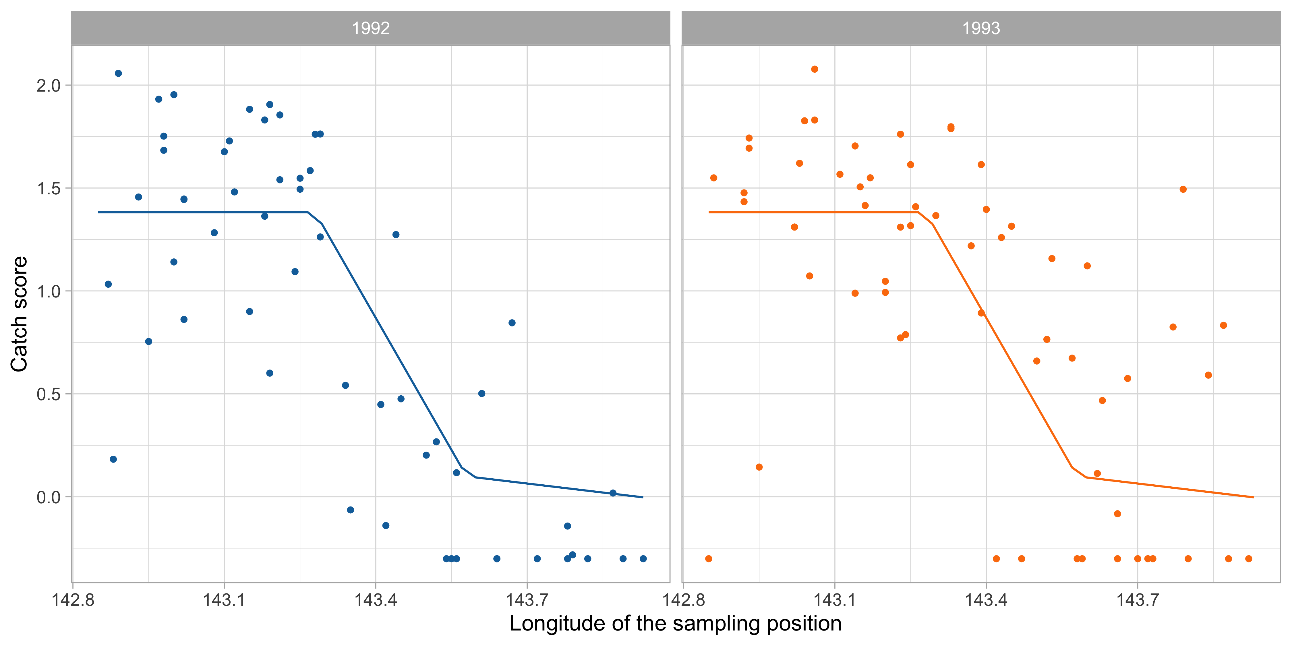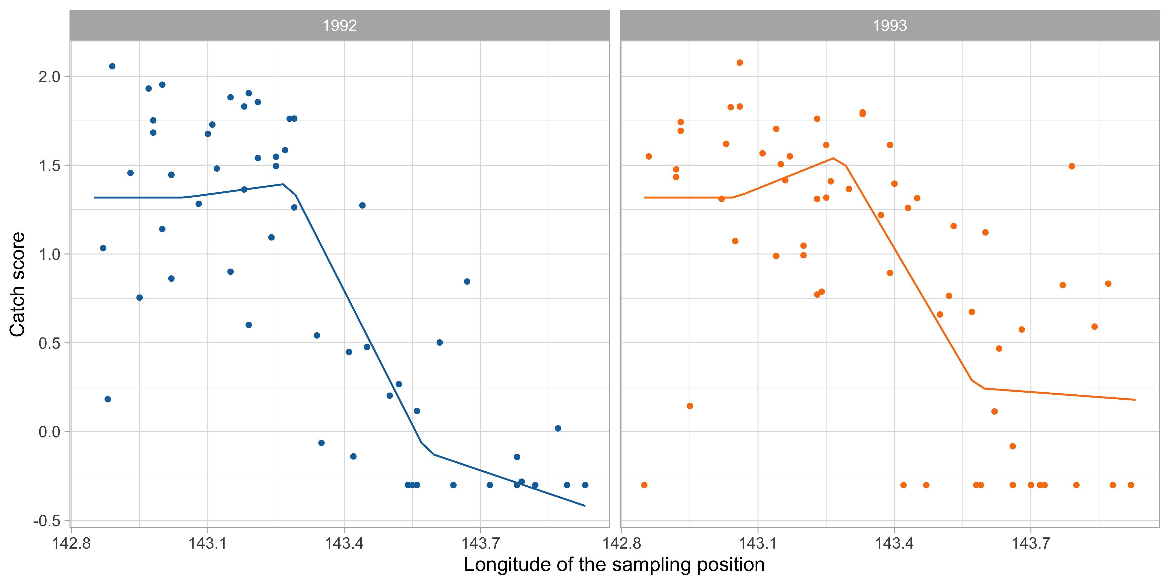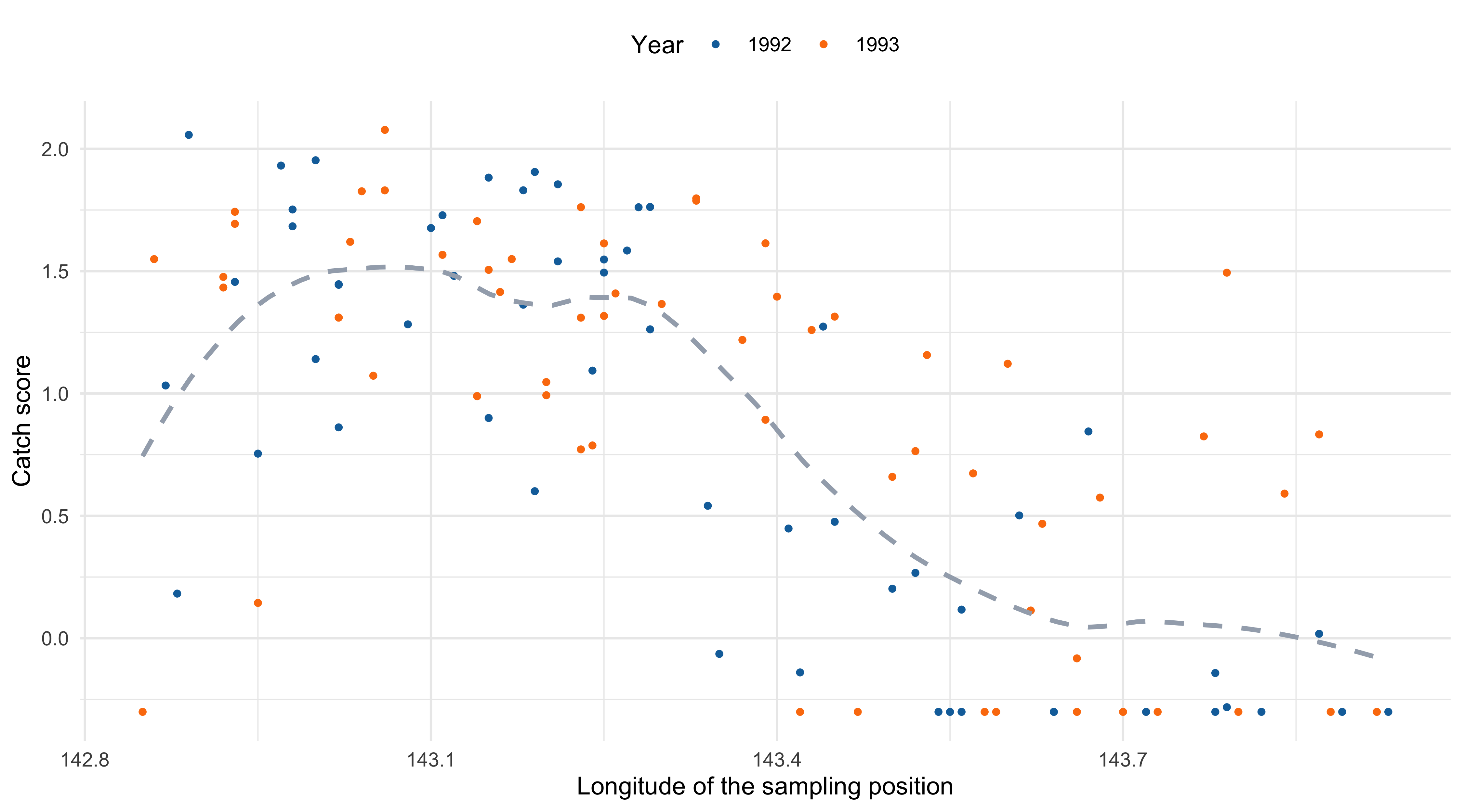Latitude and Longitude of the sampling position. The longitude can be seen as a proxy of the distance from the coast in this specific experiment;Depth of the sea on the sampling position;Zone of the sampling region, either open or closed to commercial fishing;Year of the sampling, which can be either 1992 or 1993.Having remove a few observations due to missingness, we split the data into training (119 obs.) and test set (30 obs.). The full trawl dataset is available in the sm R package.