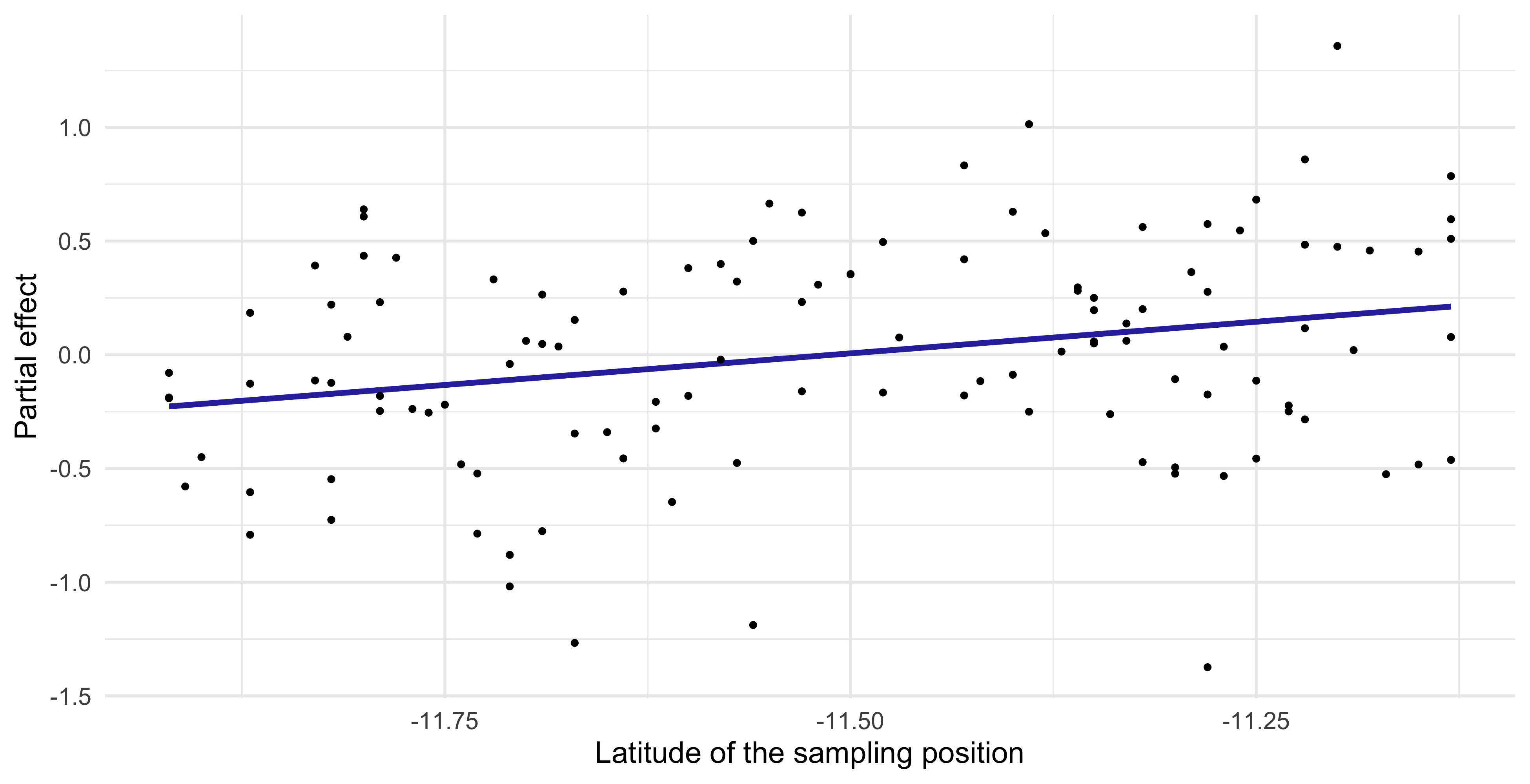 The effective degrees of freedom of Latitude is \text{df}_2 = 1, meaning that the estimated \hat{f}_2 collapsed to a linear term. The corresponding shrinkage parameter \lambda_2 is very high.
